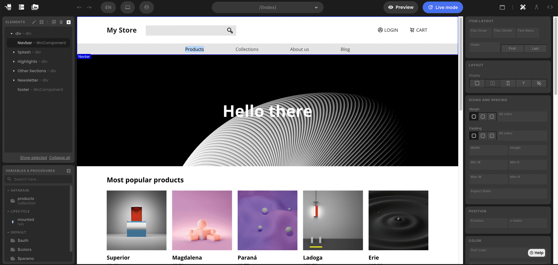 Aunque las transiciones entre paginas pueden ser un poco lentas, la carga del sitio web también y la interfaz de usuario del editor no está disponible en español, WebCat ofrece plantillas listas para usar, un editor de base de datos intuitivo y la posibilidad de configurar títulos y descripciones SEO.